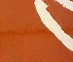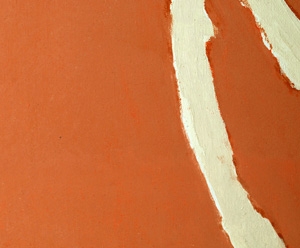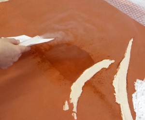 修復風景 水濡れでしみの出た現代絵画の修復 修復前。しみ部分(クリックで拡大) 真空ポンプで引きながら、超音波で発生させたミストをかけてクリーニングしています。 修復中(クリックで拡大) 画面に触れることなくしみを抜くことに成功! 修復後(クリックで拡大)
