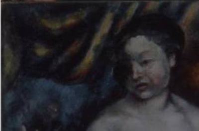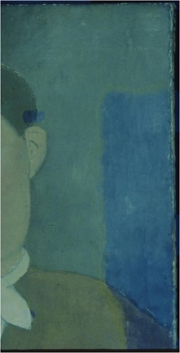 - 天然樹脂のニスの上になされた補彩は、暗く見える。