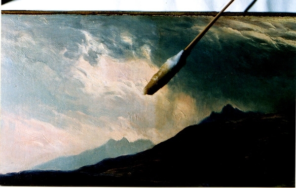 クリーニングによって、表面の埃の除去やニスの除去を行います。溶剤を用いないで乾式で行う方法と溶剤を調合して行う方法があります。変色した補彩や付着物の除去などもクリーニングに含まれます。オリジナルの絵具を傷めないで行うことが重要です。_乾式のクリーニングでは、筆やスポンジを用いて取れる汚れを取ります。溶剤を調合して行うクリーニングでは、表面の汚れやニスを除去することができます。ニスが非常に黄変している場合は天然樹脂のニスであることが多いのですが、このようなニスを除去する場合、オリジナルの油絵具に影響を与えずにニスのみを除去するように溶剤を調合してクリーニングします。ニスの暗色化が進むと、色のみではなくイメージの形もはっきり見えなくなることもあります。クリーニングにより、オリジナルの色調や形を回復させることができます。