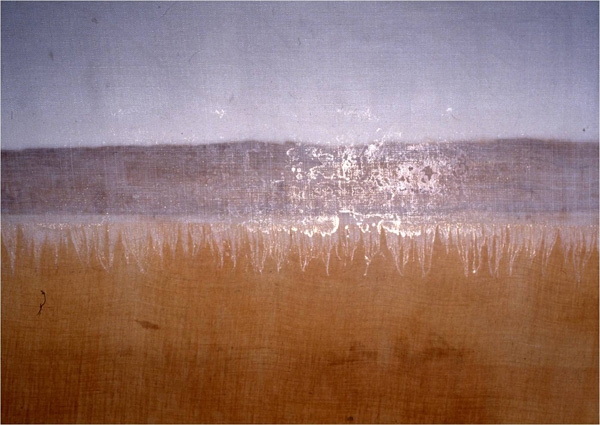 支持体の布の縁は、折り曲げられているので傷みやすく、また、釘などでとめられているので引っ張りの力がかかりやすい状態になっています。そのため、縁の折り曲げに沿って裂けたり、釘の周りの穴が広がったりなど、縁の部分に裂けや穴などの症状が出てきます。ストリップ・ライニングとは、縁のみに別の布を貼り付けて縁を強化する処置方法です。