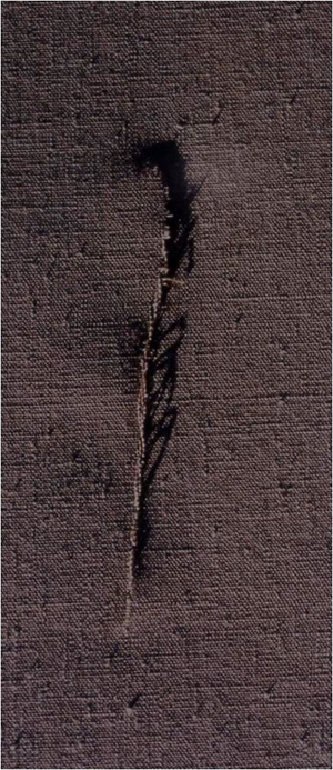 裂けや穴に対しての処置としては、まず破れた部分をふさいで布目を整え、接着します。さらにその上に糸を渡したり紙や布のパッチを貼って破れ部分を強化することもあります。症状の程度により、裂け直しの処置に続いて裏打ちを行う場合と部分的な処置のみにとどめる場合があります。