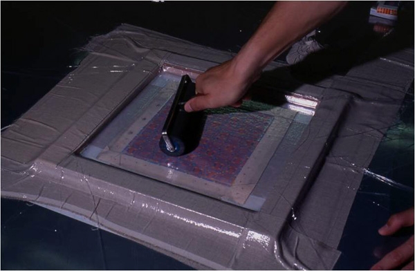 オリジナルのキャンバスの強化が必要な場合に、新しい布を接着剤でオリジナルのキャンバスの裏に貼り付ける処置です。裂けや歪みなどの症状を予防する他に、キャンバスを動きにくくして絵具層への損傷も防ぐ効果があります。最近の傾向としては、周りの環境を整えることが可能な場合には、裏打ちを避けて理想的な環境を保つことで損傷を抑える方向になってきています。