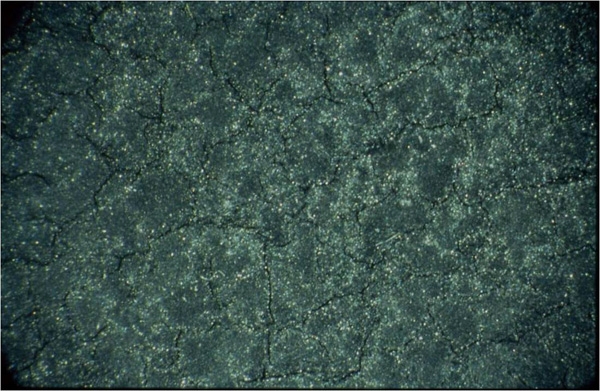 混合絵具より媒材が分離し結晶化。顕微鏡写真(クリックで拡大)