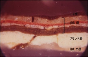 「男の像」の絵画層断面(クロスセクション顕微鏡写真)