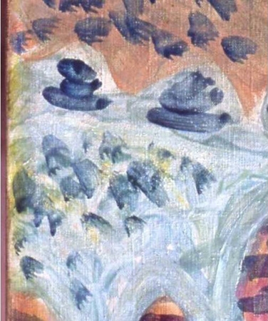 油彩画にカビが発生すると、絵具は変質し、油は分解します。カビの分泌液にはクエン酸、シュウ酸などの有機酸が含まれ、顔料と反応します。分解した絵具は、有機酸の塩となって結晶することもあります。また、カビの分泌液の中に色素がある場合は、キャンバスや紙などに赤、青、紫、黒などのしみができてしまいます。虫の害は、板絵や紙に発生する場合が多く見られます。