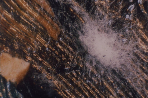 油彩画に発生したカビ、顕微鏡写真(クリックで拡大)