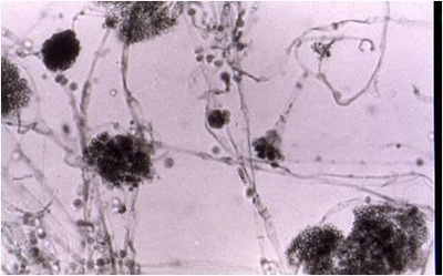油彩画に発生したカビ、培養後顕微鏡写真(クリックで拡大)