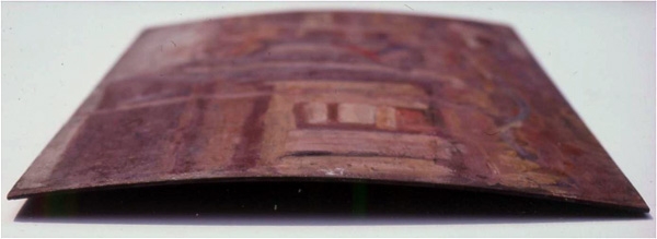 層間剥離(クリックで拡大)絵が描かれてから30年もすると、麻布は赤褐色になって脆くなり、ついには指で裂けるほどになります。また、絵画のメディウムは、年月が経つと劣化し、柔軟性を失って接着力が低下します。すると、亀裂の部分で、絵具層の端が徐々にキャンバスから浮き上がりだします。板絵の場合は板から絵具層が剥離して、ふくらみとなることもあります。表面に結晶やカビが発生する場合もあります。これらの症状はすぐに進むことがあるので、注意が必要です。