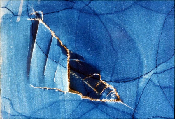 キャンバスの裂け、板の割れ、突き傷、焼け焦げ、引っ掻き傷、剥落、亀裂、絵具の変色など