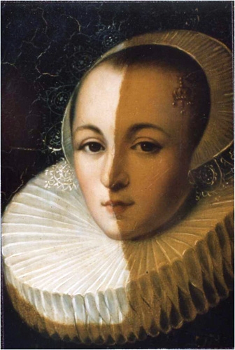 剥落(クリックで拡大)絵具層における亀裂や剥落などは、作品の構造上の欠陥や使用された物質の劣化に起因する場合が多いようです。修理の際の処置の失敗から生じている損傷もあります。絵具の褪色や変色は、絵具自体の性質にもよりますが、太陽光線や各種のガス、熱など、望ましくない環境の影響で起こることもあります