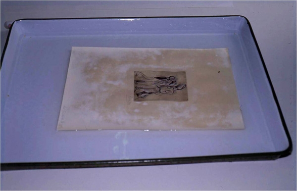 - 高い酸性度を示す紙には、脱酸処理を行い中和をはかります。油性インクによる作品など、水に反応しない作品は水浸します。さらに、重炭酸マグネシウムや水酸化カルシウムによる処理を行うことが一般的です。