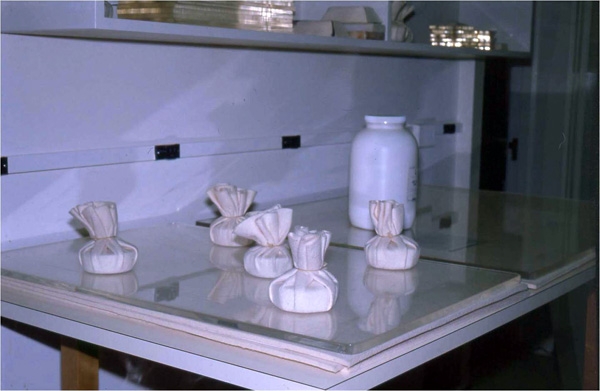 - カビや虫による害がある作品は、燻蒸を行って殺菌、殺虫するか、環境の条件を変えることが必要です。カビは、RH62%以下に保つことができれば発芽を食い止めることができます。