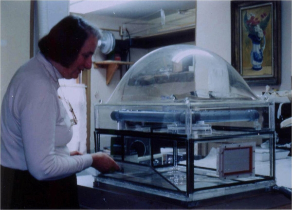 テーブル上の網を通して真空ポンプで空気を下に引くことによって、紙の作品の汚れを吸い取り紙に吸い取って除去したり、しわを直したりすることができる機器。パステル画や水彩画など、水浸できない作品の修復に適する。