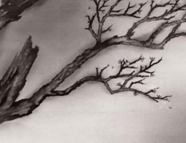 日本画/絹(部分) 修復前(クリックで拡大)かびに起因した茶色のしみが発生した。