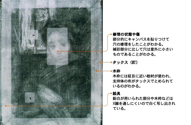 X線による検査では、支持体の構造、描法、下に描かれている絵の構造がわかる。